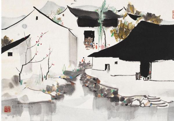 在滿足了基本需求后,孟浩凡才開始考慮,如何為這座古鎮(zhèn)保留傳統(tǒng)江南民居的神韻,又體現(xiàn)出現(xiàn)代學(xué)的美感和創(chuàng)意。他想到了畫家吳冠中。孟浩凡說,比起具象的元素,他更多考慮的是保留“氣質(zhì)”?!氨热缯f你看這色調(diào),色調(diào)是白墻綠瓦,中間有一些灰色系的這種磚,都是老色調(diào)的基底給我們的感覺。這種壓頂?shù)木€條,像吳冠中的畫,都是很抽象的嘛。畫江南民居,他畫出來很抽象的藝術(shù)畫,沒有具象的符號,但是你一看這個東西它就是江南的,因?yàn)槲蓓數(shù)倪@種曲線、線條,勾勒出了江南的這種俊秀?!?/p>