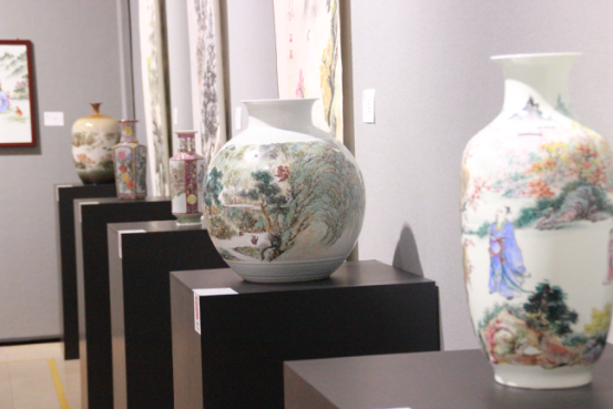 值得一提的是,劉致遠(yuǎn)除了展示山水、花鳥等畫作,同時(shí)帶來了多件精心創(chuàng)作的廣彩陶瓷作品,各種花瓶、茶具、餐具上,有人物、風(fēng)景以及動(dòng)物等彩色繪圖,雖為陶瓷擺設(shè)器具,卻也和書畫同樣具備細(xì)意觀賞的價(jià)值。