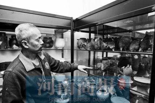 “這個(gè)是商代的鬲,這個(gè)是漢代的陶,這個(gè)是五代時(shí)期的玉枕……”河南鄭州某小區(qū),在59歲敬勤儉的家中,說(shuō)起展示柜中的藏品,他一臉的寵溺。“漂亮著呢”“好看得很”是他說(shuō)到這些寶貝時(shí)用得最多的話,這些都是敬勤儉在近20年里撿來(lái)的。