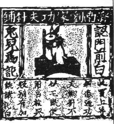 在中國(guó)國(guó)家博物館,陳列著一塊北宋年間“濟(jì)南劉家功夫針鋪”用來(lái)印刷廣告的銅雕版,其長(zhǎng)12.4厘米,寬13.2厘米,畫面正中是一只站立搗藥的白兔,左右注明“認(rèn)門前白兔兒為記”,這是在告訴買家“一定要認(rèn)準(zhǔn)本店的白兔搗藥商標(biāo)進(jìn)行選購(gòu)”;白兔下方廣告文辭稱:“收買上等鋼條,造功夫細(xì)針,不誤宅院使用。轉(zhuǎn)賣興販,別有加饒,謂記白”,意思是說:“我們家用最好的原材料,花費(fèi)功夫造針,使用方便。如果有人想批發(fā)轉(zhuǎn)買,還可以優(yōu)惠,但要告訴買者或注明是白兔牌的產(chǎn)品”。這件“濟(jì)南劉家功夫針鋪”銅雕版是已知世界上最早出現(xiàn)的商標(biāo)廣告實(shí)物。宋代使用銅版印刷的廣告,既可以做產(chǎn)品的包裝,也可以做廣告招貼的海報(bào)或者傳單,這種紙單在宋代叫“仿單”或“裹貼”。