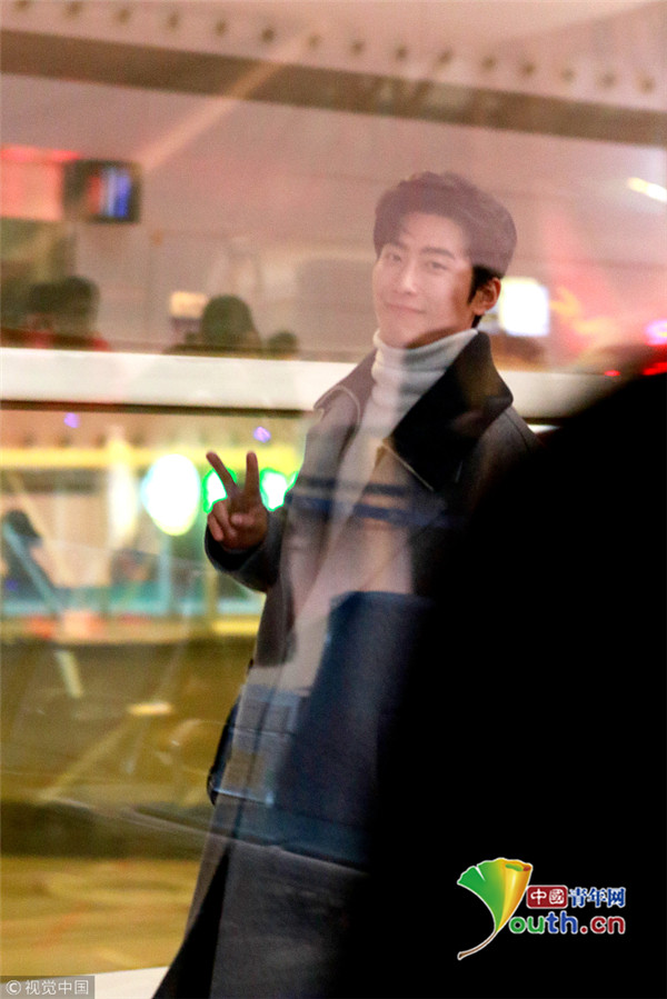 2017年12月11日,無錫,竇驍灰大衣帥氣現(xiàn)身無錫機(jī)場,見攝影師拍圖隔著玻璃比V,暖男無疑了!