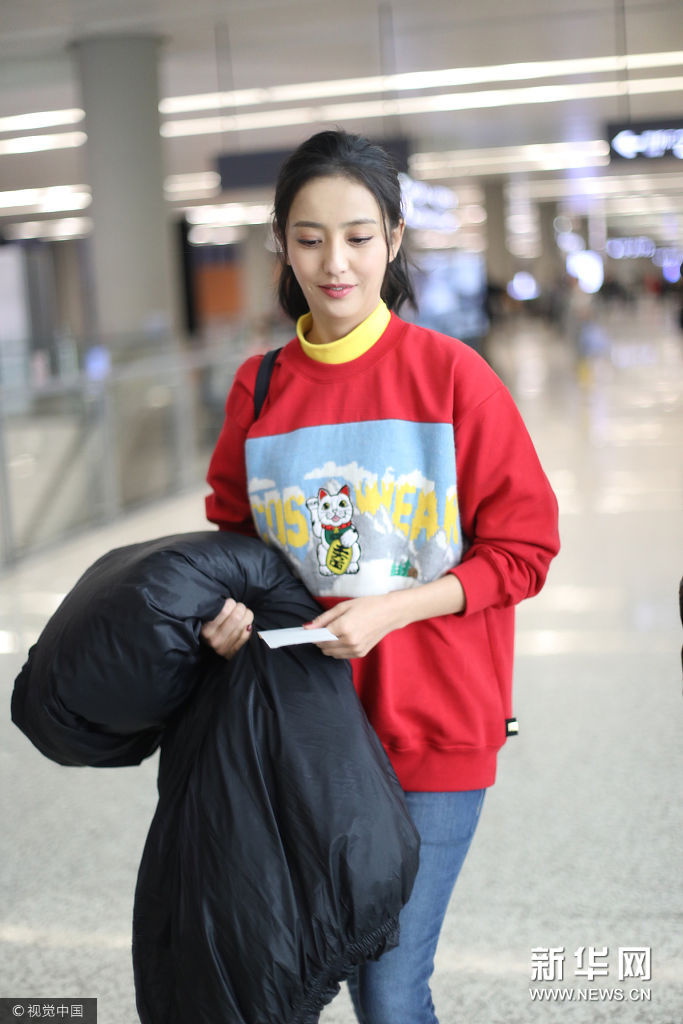 ??? 佟麗婭機(jī)頭梳半丸子頭,身穿GCDS 2017秋冬系列招財(cái)貓雪山風(fēng)景印花紅黃拼色高領(lǐng)衛(wèi)衣,下身穿磨邊緊身牛仔鉛筆褲,腳踩GGDB五角星小白鞋,手拿黑色羽絨服,肩背黑色單肩包。