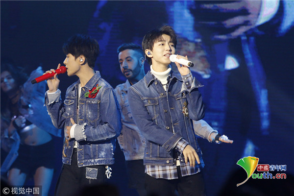 ??? 北京,12月12日晚,王俊凱、易烊千璽現(xiàn)身某活動(dòng),兩人身穿牛仔外套獻(xiàn)唱嗨翻全場(chǎng),又換上紅色衛(wèi)衣舉廣告宣傳標(biāo)語(yǔ)