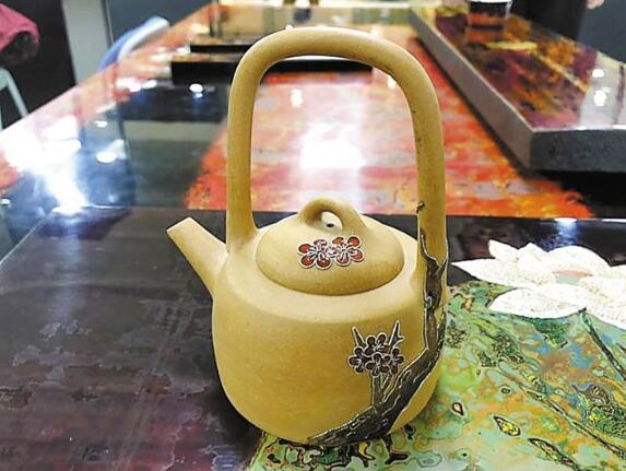 ▲梅花繞蔓生掐絲景泰藍紫砂手作壺。