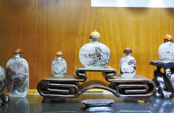 談及創(chuàng)作過程,楊藝說,鼻煙壺內(nèi)畫的制作,一般是在水晶壺或素玻璃壺內(nèi)壁,用特制的細(xì)筆,蘸取少許墨汁顏料,從小口中深入瓶中,反手作畫。創(chuàng)作內(nèi)畫,在常人看來,不可思議之處是有限的空間以及需要反手作畫,這也是每一個(gè)內(nèi)畫師面臨的主要難題所在,“創(chuàng)作內(nèi)畫時(shí),需要在這盈寸天地間做到手指和筆桿揮灑自如,這極其考驗(yàn)一個(gè)人的耐性。一手執(zhí)壺,一手作畫,作畫時(shí)需要在壺內(nèi)反手描繪,如此,才能讓人們?cè)谕獠靠吹秸娴漠嬒窠Y(jié)構(gòu)?!眱?nèi)畫的難度還在于,要長(zhǎng)期低頭畫畫,因此還導(dǎo)致頸椎疼痛,中途為了治療疼痛休畫了好長(zhǎng)一段時(shí)間。