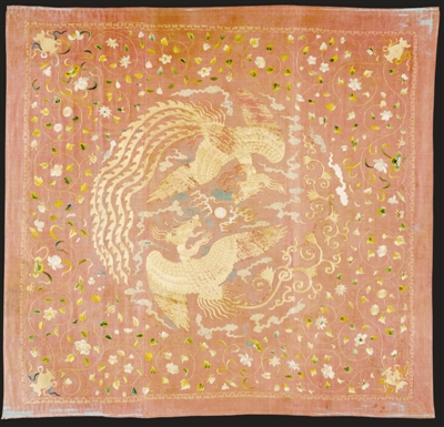 明清時期,羽翼華麗的鳳凰從遙遠(yuǎn)的天上下降凡間,將一切美好灑向人間,這一時期織物上常見以纏枝花卉紋樣搭配鸞鳳、對鳳之裝飾手法,或配上菊花、蓮花、牡丹等人們喜聞樂見的四季平安花卉,鳳穿牡丹、鳳踏蓮花、龍鳳翔云等等吉祥紋樣以寫實手法細(xì)膩的表現(xiàn),無疑體現(xiàn)古人的思想和審美。