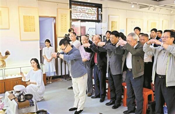 絲竹管弦伴著《詩(shī)經(jīng)》吟誦,古雅之風(fēng)貫穿了古今。當(dāng)天除了慕雅思古之外,亦有崇賢。參加活動(dòng)的眾人,向書(shū)圣王羲之的畫(huà)像作揖、致敬。羅烈杰、盧紹武、李靜現(xiàn)場(chǎng)做了熱情洋溢的講話,他們鼓勵(lì)書(shū)界同仁要團(tuán)結(jié)努力,既要繼承傳統(tǒng)、又要推陳出新,不斷弘揚(yáng)中華民族的優(yōu)秀文化。禮畢后,著名古琴家高建國(guó)現(xiàn)場(chǎng)操琴。除此之外,還有精彩的茶藝、二胡表演等等。