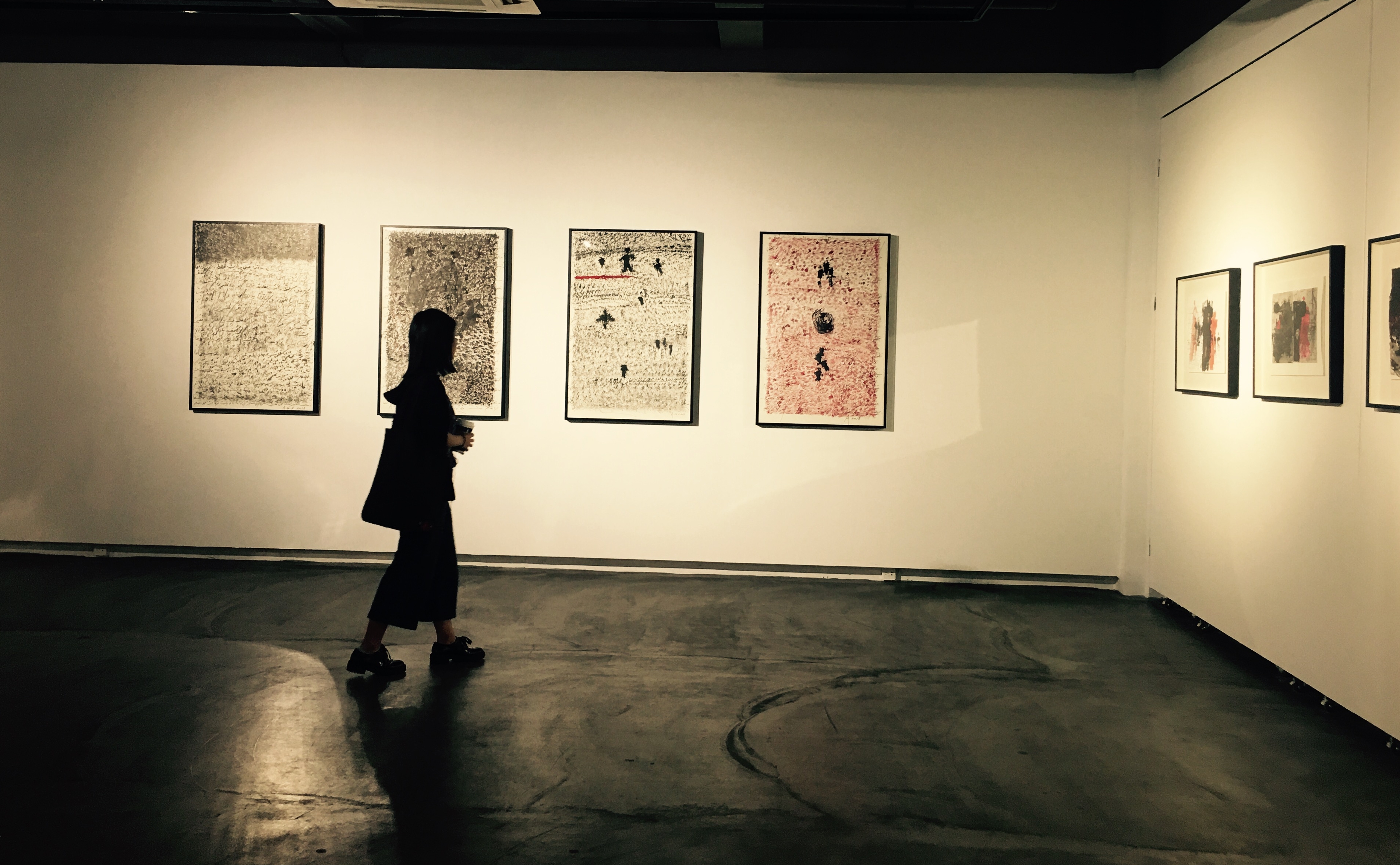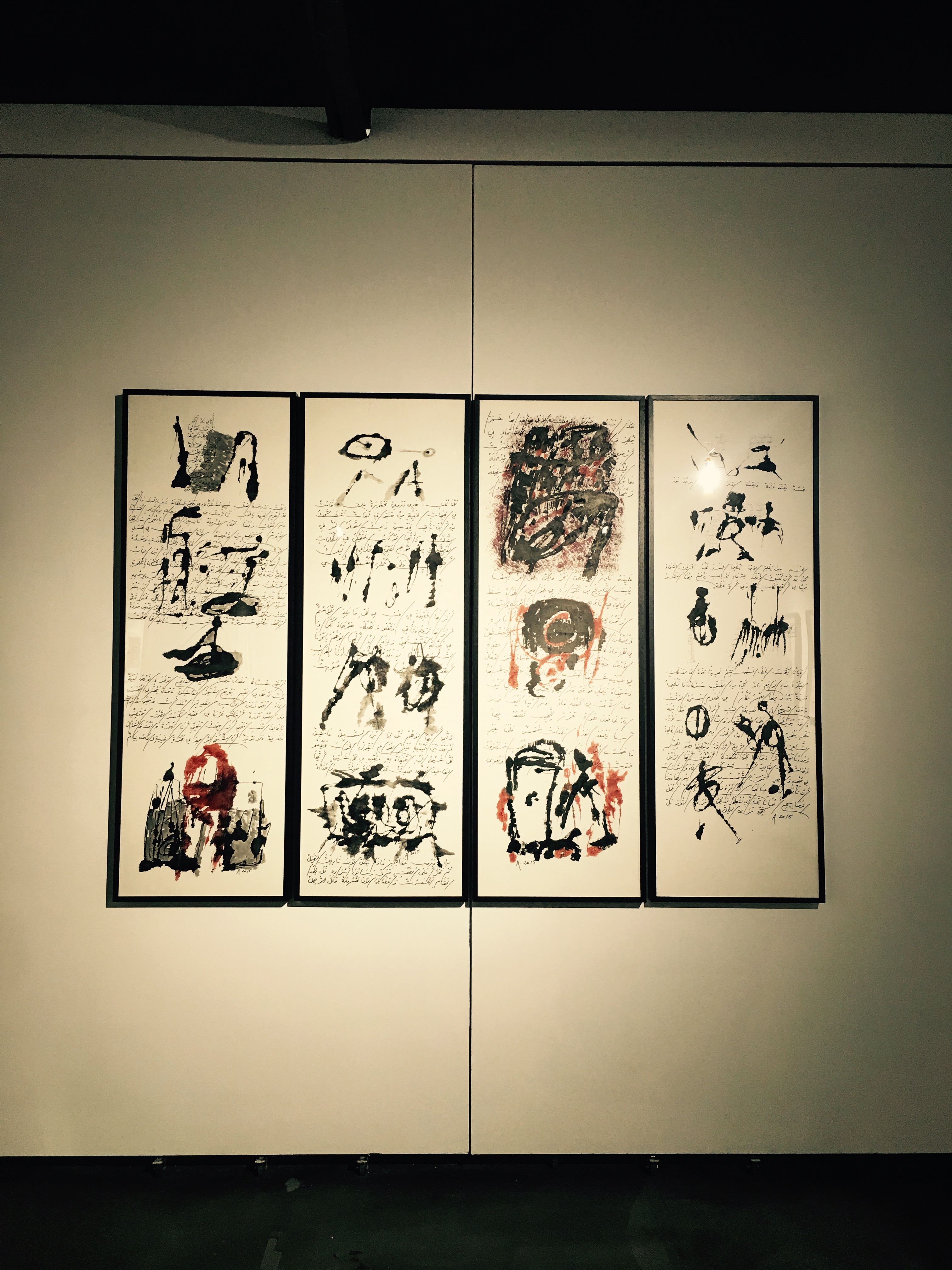阿多尼斯的畫平靜、深邃,而又暗流涌動(dòng),光芒四射。那些騰躍于拼貼和暈染、抽象和寫意之間的效果,無論有多么率性隨機(jī)以至近乎游戲,都是那么元?dú)獬渑?,韻致飽滿,那么令人既得享酣暢淋漓的解放感,又不由自主地陷入深長的回味冥思。無論是怎樣的不拘一格,僅就色彩言,黑與紅及其不同的變奏,可以說構(gòu)成了這些作品的基調(diào)。