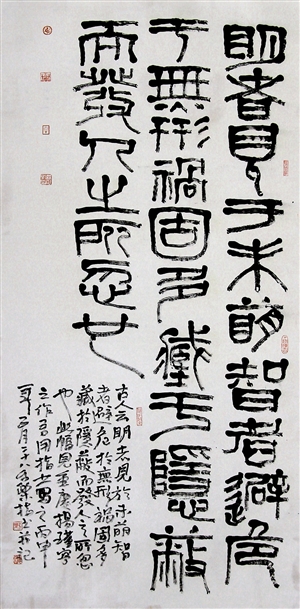 王和平以手指蘸墨,以手為筆,或疾或緩,不到十分鐘,一幅恰似石鑿雕刻力透紙背的書法作品躍然紙上,其變幻莫測的創(chuàng)作手法和獨特風格令人叫絕。顯然,用手指畫的難度比用筆畫大得多。一般書寫一個字需要用手指蘸墨幾次以上,但又必須使字形整體合理自然,筆畫形式流暢靈動,不至于顯露手工痕跡,不至于給人以呆滯和工藝性強的感覺。要恰到好處地體現(xiàn)筆畫的緊湊、粗細、虛實、枯榮,是一件很不容易的事。功夫全在指頭,既非一日之功,也非人人可以練就。