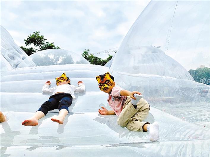 在本屆鳳凰花嘉年華主會場——華僑城體育文化中心綠地空曠自然的草坪上,由本土新銳建筑設(shè)計(jì)師黃澤林設(shè)計(jì)和創(chuàng)作的巨型充氣建筑“空氣山”拔地而起。人們可以自由地在“空氣山”的多維表面上嘗試坐、臥、立、躺的體驗(yàn)。而張凱琴、張齊努、劉小青三位國內(nèi)知名自然藝術(shù)家即興創(chuàng)作的“歇腳云”等自然裝置,通過空間藝術(shù)作品與公眾的互動,喚醒著人們對自然的熱愛。