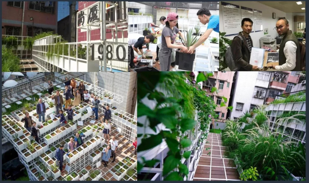 來(lái)自本地智慧的聯(lián)合創(chuàng)始人謝克非先生介紹說(shuō),作為城中村改造的實(shí)踐者,我們?cè)谧鼍褪侨绾卧谶@些矛盾中獲得共生?;蛘哒f(shuō),如何把所有矛盾點(diǎn)結(jié)合起來(lái),讓城中村可以可持續(xù)地發(fā)展。所以在2018年3月聯(lián)合大自然保護(hù)協(xié)會(huì)(TNC)、桃花源生態(tài)保護(hù)基金會(huì)、深圳市城市規(guī)劃設(shè)計(jì)研究院、聯(lián)合公設(shè)發(fā)布了綠色天臺(tái):愚公計(jì)劃2.0——崗廈1980海綿城市綠色屋頂示范項(xiàng)目。這個(gè)綠植天臺(tái)不僅是能夠美化環(huán)境,截存雨水、循環(huán)灌溉綠植等,更重要的是我們希望它作為一個(gè)平臺(tái),把NGO的理念注入城中村,讓大家把對(duì)城中村的注意力從貧富懸殊、拆遷轉(zhuǎn)移到綠色環(huán)保,促進(jìn)可持續(xù)的發(fā)展。這里不僅是個(gè)景觀的平臺(tái),更是內(nèi)容發(fā)動(dòng)機(jī),能夠持續(xù)地產(chǎn)生更多的內(nèi)容。通過(guò)藝術(shù)、教育、公益等不同板塊的活動(dòng),以內(nèi)容的方式,把文化、環(huán)保、可持續(xù)發(fā)展等的信號(hào)不斷在這個(gè)點(diǎn)上發(fā)散出去,讓大家重新認(rèn)識(shí)城中村,從持續(xù)性的內(nèi)容信息實(shí)現(xiàn)社區(qū)營(yíng)造,服務(wù)不同階層的人,讓更多人覺(jué)得環(huán)保、教育這件事情其實(shí)是非常有趣的,不生硬的,大家會(huì)主動(dòng)繼續(xù)攜手服務(wù)社區(qū)。