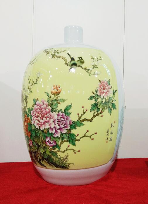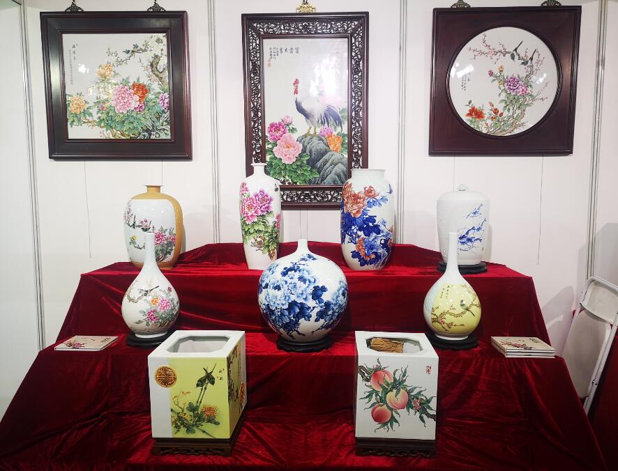 江西省陶瓷技能大師、江西省高級工藝美術(shù)師、惲派花鳥第十二代傳人、景德鎮(zhèn)青年陶瓷藝術(shù)家劉嘉鴻此次展會展出的陶瓷藝術(shù)作品共計(jì)35件,包含瓷板畫、瓷瓶、瓷盤、青花瓷、青花斗彩瓷等,其中《春滿園》、《錦堂富貴》、《長壽圖》等作品呈現(xiàn)陶瓷技藝,展示出劉嘉鴻深厚的藝術(shù)造詣。