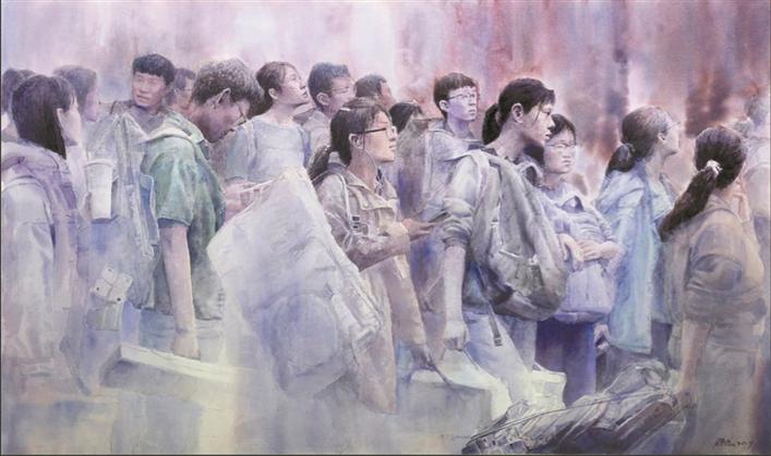 藝術(shù)家方曉龍此次有兩件作品入選,分別是水彩畫《追夢》和與青年藝術(shù)家張凱合作的油畫《掠過晨曦的夢想》。兩幅作品聚焦同一主題——青年學子參加藝考,這來自他對這一題材長年累月的觀察。