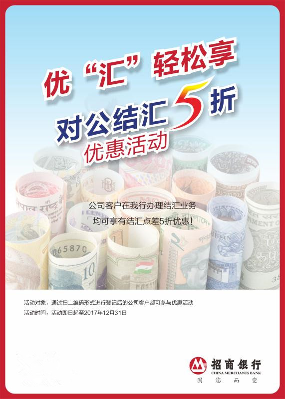 近日,記者從招行深圳分行了解到,自2017年8月1日至2017年年底,招商銀行深圳分行特別推出結(jié)匯尊享優(yōu)惠活動(dòng)?;顒?dòng)期間,凡公司客戶(hù),可在招商銀行深圳分行轄內(nèi)(含珠海分行及惠州分行)任一網(wǎng)點(diǎn)通過(guò)掃描指定二維碼進(jìn)行登記,登記后辦理結(jié)匯業(yè)務(wù)即可享受結(jié)匯點(diǎn)差五折優(yōu)惠。(張怡)