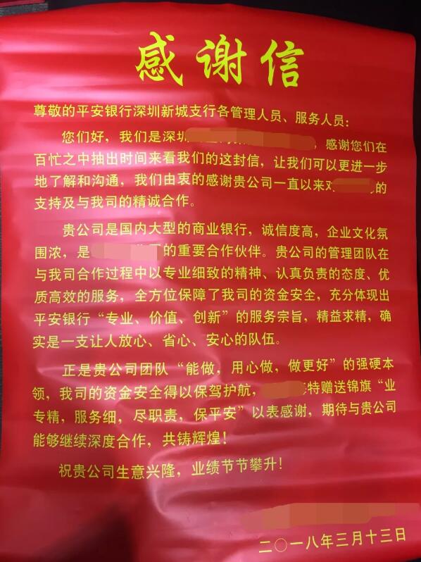 深圳新聞網訊 日前,平安銀行深圳分行分支行聯(lián)動想方設法勸阻客戶,成功堵截了一起詐騙,幫助客戶避免了500多萬元的資金損失,并協(xié)助警方抓獲了詐騙犯罪嫌疑人。此次成功堵截詐騙,得到了客戶和家屬的高度贊揚,專程送來了錦旗和感謝信,稱贊平安銀行“業(yè)專精、服務細、 盡職責、保平安”。