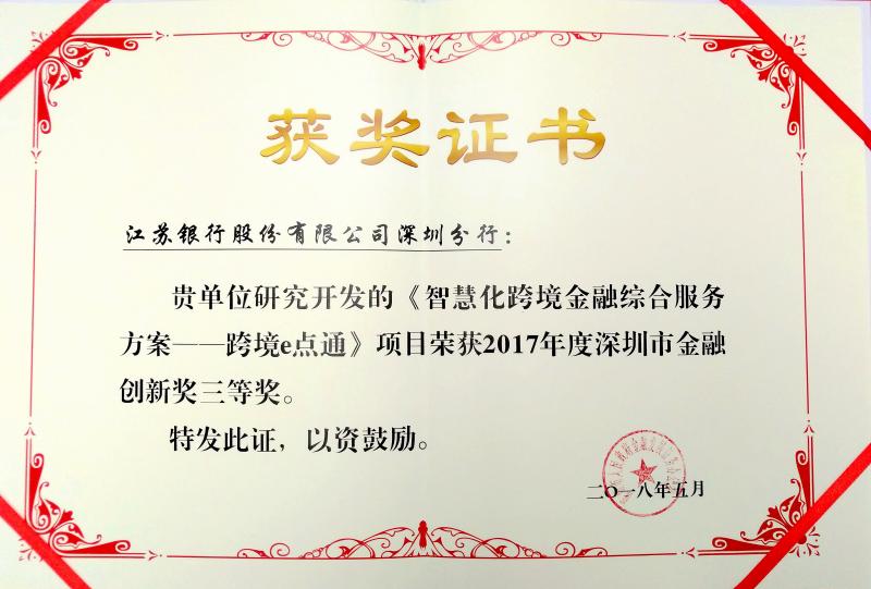 深圳新聞網(wǎng)訊 日前,深圳市政府2017年度金融創(chuàng)新獎評選結果揭曉,江蘇銀行深圳分行“智慧化跨境金融綜合服務方案—跨境e點通”項目斬獲三等獎,這是該行連續(xù)四年獲得金融創(chuàng)新獎后再次獲此殊榮,該行也由此成為深圳地區(qū)唯一一家五次榮獲金融創(chuàng)新獎的城商行。