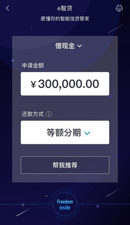全新升級(jí)Freedom引擎后的e智貸,借助其自身的Freedom核心推薦的強(qiáng)大功能,通過極速的信息搜集和計(jì)算,可秒級(jí)判斷可貸額度,并為客戶量身推薦e招貸、e閃貸、分期還款等多種產(chǎn)品。