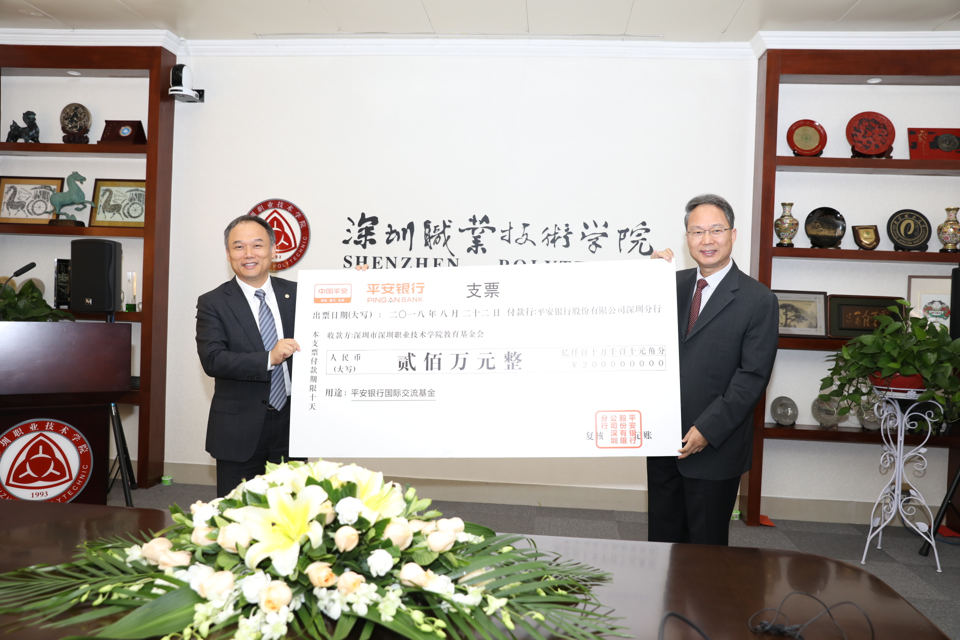 2018年11月22日,平安銀行與深圳職業(yè)技術(shù)學(xué)院校園一卡通項(xiàng)目交付儀式暨國際交流基金捐贈儀式在深圳職業(yè)技術(shù)學(xué)院101會議室隆重舉行。平安銀行行長助理、深圳分行楊志群行長、孫芳滔副行長、陳宏敬副行長、高寒竹零售總監(jiān),深圳職業(yè)技術(shù)學(xué)院陳秋明黨委書記、唐曉鳴副校長、董朝君副校長等領(lǐng)導(dǎo)出席了儀式。