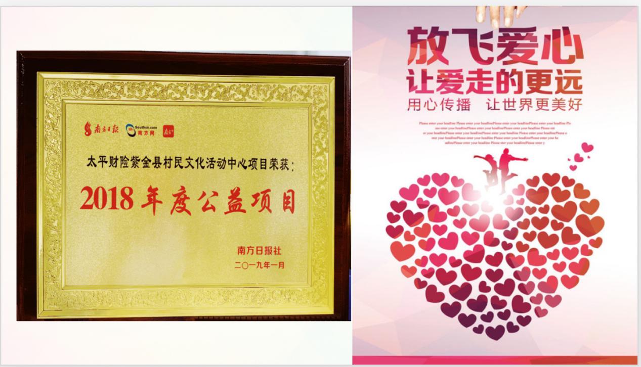 太平財(cái)產(chǎn)保險(xiǎn)有限公司深圳分公司于2017年捐助紫金縣竹塘村村民文化中心工程,獲得了公益項(xiàng)目獎(jiǎng)。太平財(cái)險(xiǎn)負(fù)責(zé)人表示,在集團(tuán)“共享太平”的旗幟下,深圳分公司將繼續(xù)服務(wù)實(shí)體經(jīng)濟(jì),關(guān)注公益活動(dòng),助力鄉(xiāng)村振興,有力落實(shí)央企責(zé)任。