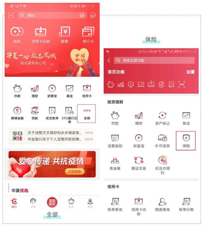 溫馨提示:如果您尚未對您及您的家庭做保險配置,在疫情時期可以通過華夏銀行手機銀行APP足不出戶配齊保險保障。您只需要打開華夏銀行手機銀行,在首頁通過“全部”菜單,進入“投資理財”板塊,點擊“保險”即可進入保險板塊,按照產(chǎn)品類型、場景選擇您需要的產(chǎn)品進行購買。