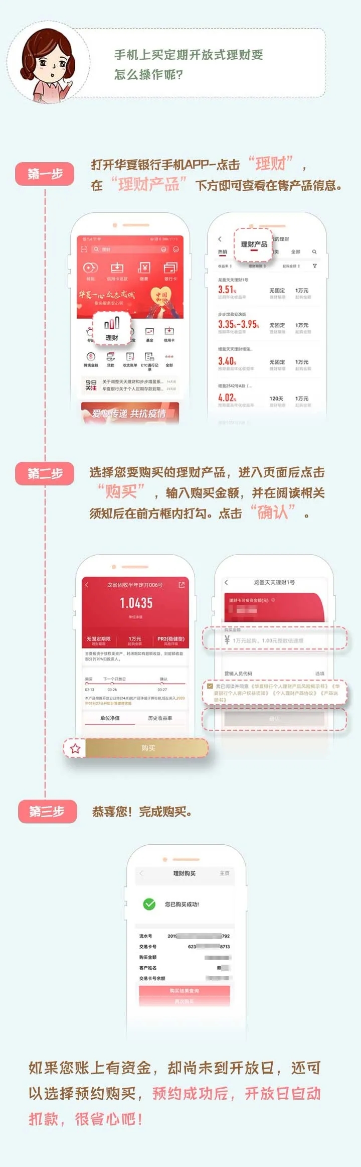 B:盡管足不出戶,您依然能享受著華夏銀行便捷安全的線上服務(wù),開展投資理財業(yè)務(wù),辦理理財產(chǎn)品、信托產(chǎn)品、代銷證券類產(chǎn)品的認(rèn)申購、贖回等。