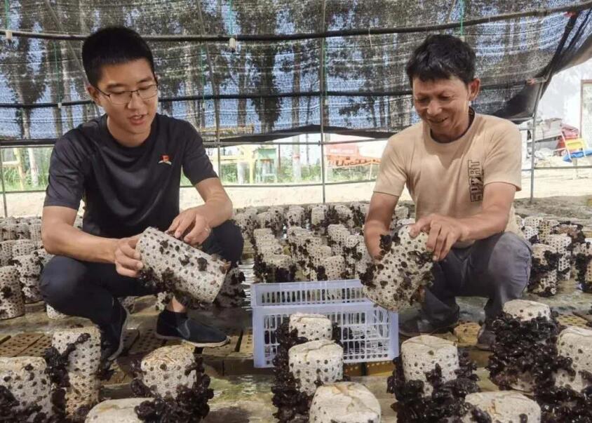 來自太平人壽新疆分公司的振興村駐村第一書記,正在查看木耳長勢