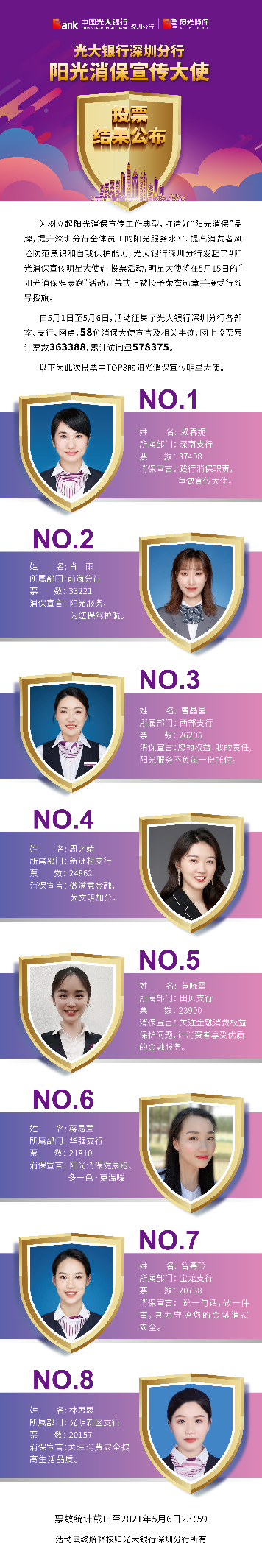 深圳新聞網·見圳客戶端2021年5月8日訊 昨日,光大銀行深圳分行“陽光消保宣傳明星大使”線上投票圓滿結束,從58名宣傳大使中投票產生了賴春妮、肖雨、曹晶晶、周之靖、黃曉霞、蔣易萱、曾粵玲、林思思8名陽光消保宣傳明星大使。明星大使將在5月15日的“陽光消保健康跑”活動開幕式上被授予榮譽勛章并接受行領導授旗。5月1日,光大銀行深圳分行發(fā)起了“陽光消保宣傳明星大使”線上投票,旨在樹立起陽光消保宣傳工作典型,打造“陽光消?!逼放?,提升深圳分行全體員工的陽光服務水平,提高消費者風險防范意識和自我保護能力,提升光大在深圳地區(qū)的品牌影響力。投票活動得到社會熱烈響應,據統(tǒng)計,此次累計票數達363388次。