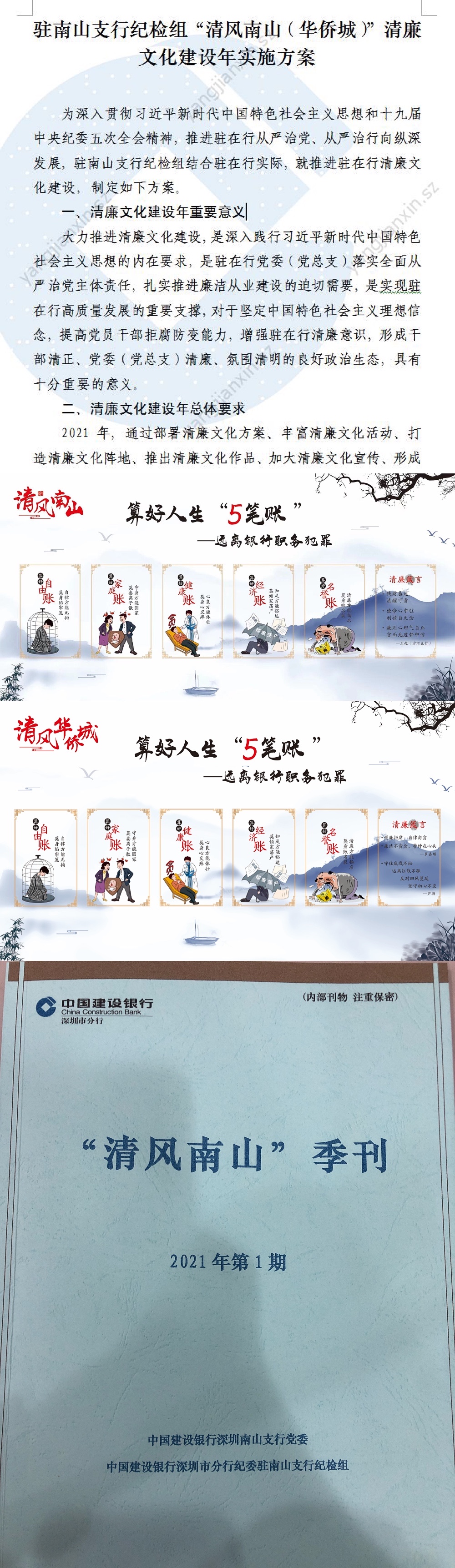 深圳新聞網(wǎng)6月9日訊 為充分發(fā)揮清廉文化的教育、激勵、凝聚、導(dǎo)向和約束作用,響應(yīng)深圳銀行業(yè)保險業(yè)清廉金融文化核心理念,積極培育厚德養(yǎng)廉的政治生態(tài),著力助推駐在行干部清正、黨委清廉、政治清明、生態(tài)清朗的清廉文化建設(shè),近日,建行深圳市分行駐南山支行紀檢組制定推出了《“清風南山(華僑城)”清廉文化建設(shè)年實施方案》。該方案以“6講”為依托,明確清廉文化建設(shè)5大任務(wù),即:弘揚清廉價值理念、豐富清廉文化活動、打造清廉文化陣地、推出清廉文化作品、攜手清廉文化共建。