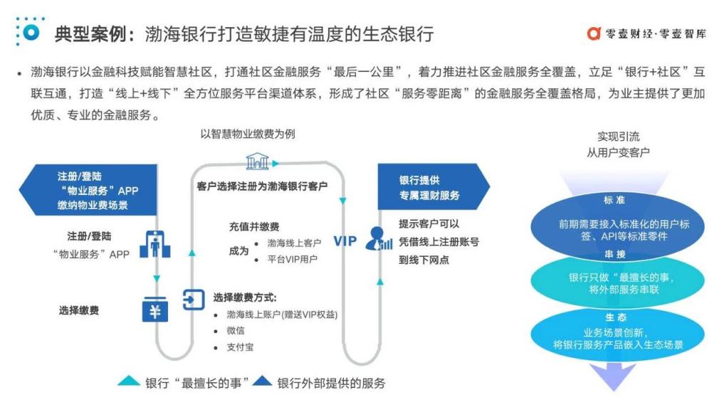 以此次該行入圍行業(yè)權(quán)威報(bào)告的“智慧物業(yè)”金融科技創(chuàng)新服務(wù)項(xiàng)目為例,渤海銀行創(chuàng)新業(yè)務(wù)場(chǎng)景——繳納物業(yè)費(fèi)場(chǎng)景,社區(qū)居民通過(guò)“物業(yè)服務(wù)APP”繳納物業(yè)費(fèi)時(shí),可以選擇渤海銀行線上賬戶為付費(fèi)方式,當(dāng)用戶充值并繳費(fèi)后,便同時(shí)成為了渤海銀行線上客戶和平臺(tái)V IP,并享受銀行提供的專屬理財(cái)服務(wù)。通過(guò)將自身服務(wù)產(chǎn)品嵌入“物業(yè)服務(wù)”A PP,只做“最擅長(zhǎng)的事,渤海銀行將外部服務(wù)串聯(lián)”,最終實(shí)現(xiàn)A PP用戶到自身客戶的轉(zhuǎn)變。