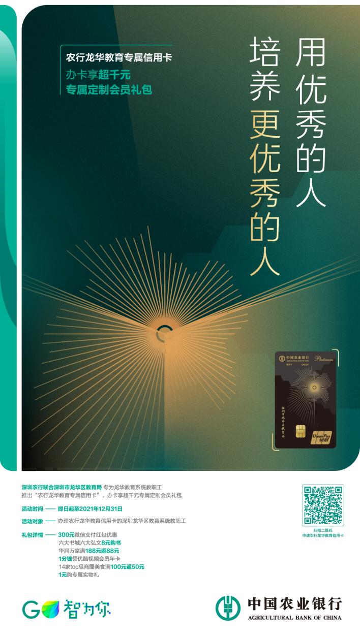 2019年至今,農(nóng)行深圳分行與龍華區(qū)教育局已就銀校通等項目開展深度合作,為龍華區(qū)智慧校園的發(fā)展提供了強有力的支撐。2021年,雙方進(jìn)一步擴(kuò)大合作領(lǐng)域,聯(lián)合發(fā)行深圳地區(qū)首張教育聯(lián)名卡:龍華教育專屬信用卡。該卡結(jié)合龍華教育的主題和理念,設(shè)計了專屬特色卡面,豎版設(shè)計別具一格,元素簡潔錯落有致;卡面主體為太陽和龍華區(qū)地圖,并將龍華區(qū)教育局的地理位置巧妙融入光線中,象征教育的光輝照耀整個龍華。卡面背景黑灰相間,似階梯,又似山脈,在凸顯“教育是人類進(jìn)步的階梯”主題的同時,又暗喻了教育從業(yè)者銳意進(jìn)取,勇攀高峰的堅持和追求??嬉院诮馂橹魃{(diào),線條簡潔,寓意深刻,高端大氣。