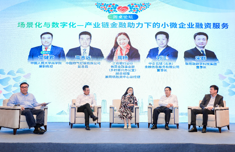 在論壇對話環(huán)節(jié),工行總行普惠金融事業(yè)部副總經(jīng)理兼網(wǎng)絡融資中心總經(jīng)理周楊、核心企業(yè)代表中國燃氣控股有限公司副總裁高志遠、供應鏈服務機構代表中企云鏈(北京)金融信息服務有限公司董事長劉江和聯(lián)易融數(shù)字科技集團董事長宋群共同探討了如何以融合和創(chuàng)新方式,通過產(chǎn)業(yè)鏈金融助力小微企業(yè)融資服務,互相交換在產(chǎn)業(yè)鏈金融發(fā)展方面的經(jīng)驗和智慧。