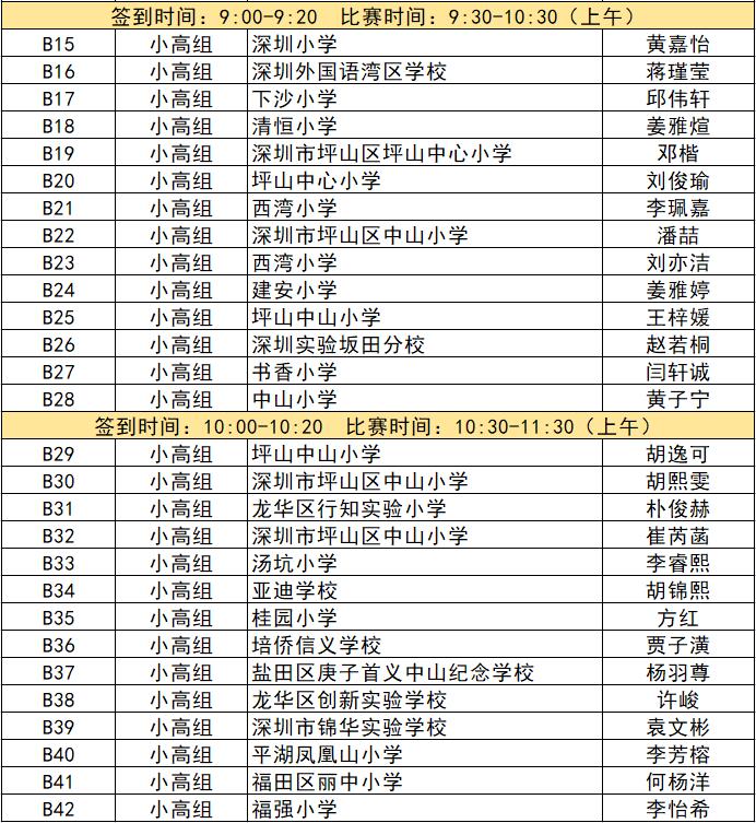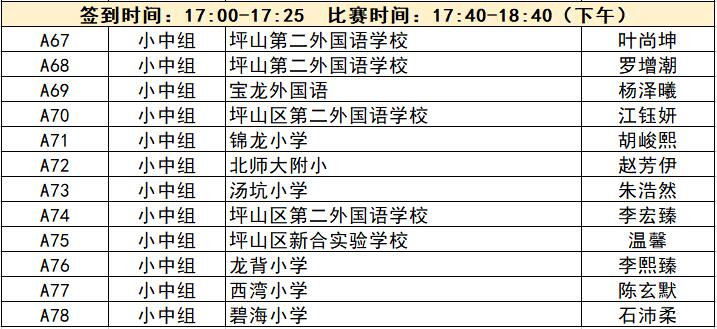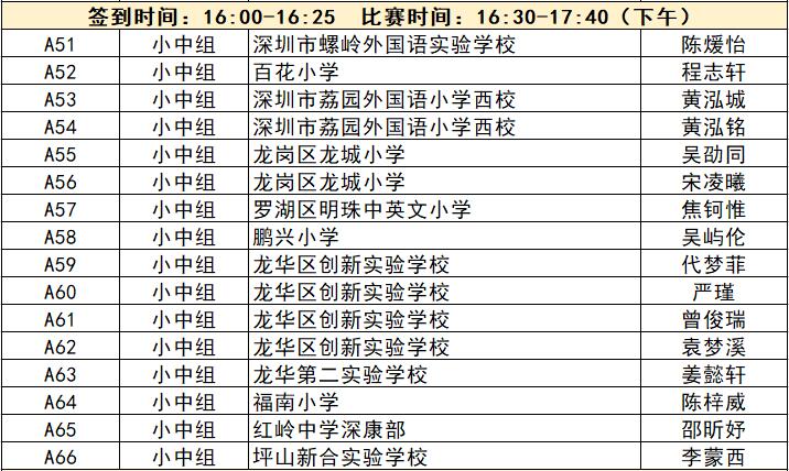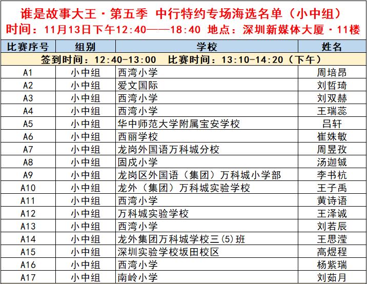 “誰是故事大王·第五季”分為小中組和小高組,此次中行特約專場海選報名的學(xué)生將以脫稿的形式,不限主題,在限時5分鐘內(nèi),講述積極健康向上的故事。評委老師們將從四個維度進(jìn)行評分,其中內(nèi)容占50%、表現(xiàn)技巧占30%、儀態(tài)占10%,以及時間掌控、創(chuàng)意特色呈現(xiàn)等占10%。最終,本場活動將選拔出部分學(xué)生晉級“誰是故事大王·第五季”深圳市復(fù)賽,他們將和來自指定校園分賽區(qū)、特約專場以及線上分賽區(qū)的選手一起爭奪深圳市決賽名額。現(xiàn)將上場順序(即所在小組的序號順序)、名單、簽到時間、比賽時間公布如下: