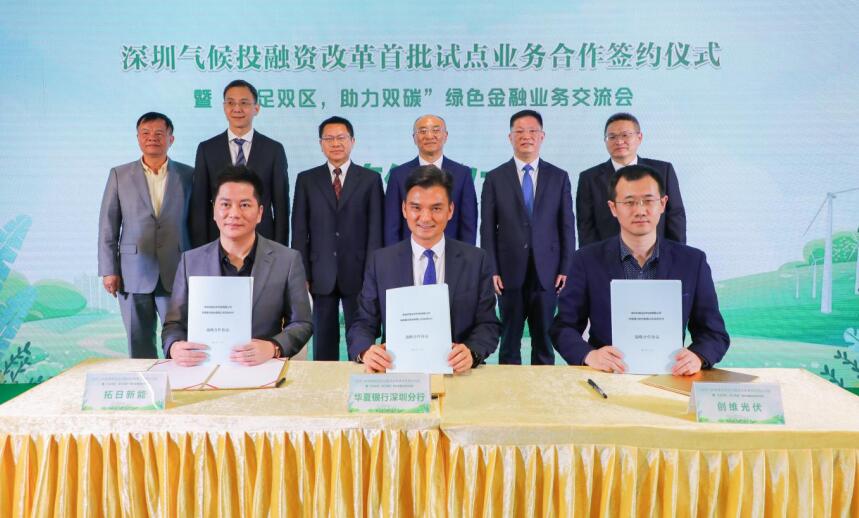 在與會領導嘉賓的共同見證下,華夏銀行深圳分行分別與深圳市創(chuàng)維光伏科技有限公司、深圳市拓日新能源科技股份有限公司簽署了《深圳氣候投融資改革首批試點業(yè)務合作協(xié)議》。