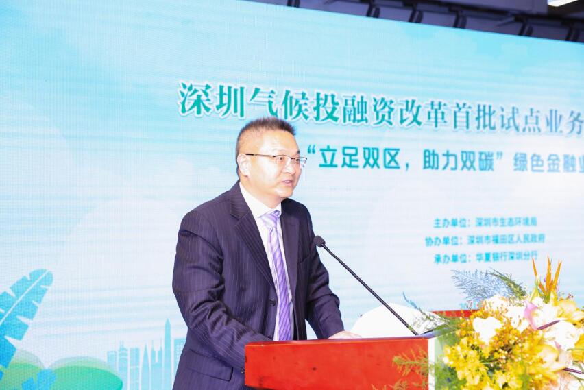 國家生態(tài)環(huán)境部氣候司司長李高,深圳市政府副秘書長劉昂,深圳市生態(tài)環(huán)境局局長李水生,深圳市委改革辦副主任孫華明,福田區(qū)政府副區(qū)長朱江,華夏銀行總行黨委委員、營銷總監(jiān)、深圳分行黨委書記、行長陳傳龍等領導出席。深圳市政府、深圳市生態(tài)環(huán)境局、市委改革辦、中國人民銀行深圳市中心支行、福田區(qū)政府相關負責人、深圳市綠色企業(yè)代表、深圳市綠色相關行業(yè)協(xié)會代表、華夏銀行深圳分行相關單位代表等70余人參加活動。