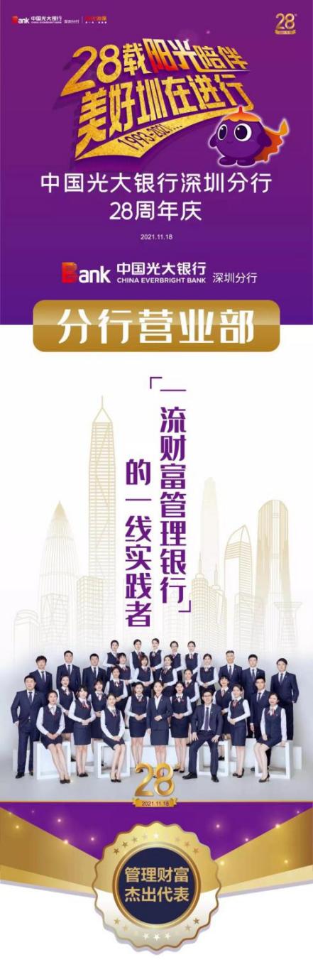 在成立28周年之際,光大銀行深圳分行開展28周年“十大最美光陰故事”評選包括管理財富、服務民生、支持實體經(jīng)濟、創(chuàng)新金融科技、履行社會責任等五大領域,旨在評選出28年來在這五大領域的杰出案例,樹立標桿,為分行發(fā)展打造“頭雁”矩陣。引領分行各項業(yè)務邁入高質(zhì)量發(fā)展新臺階。讀懂了“十大最美光陰故事”,也就讀懂了光大銀行深圳分行的奮斗、執(zhí)著和希冀。