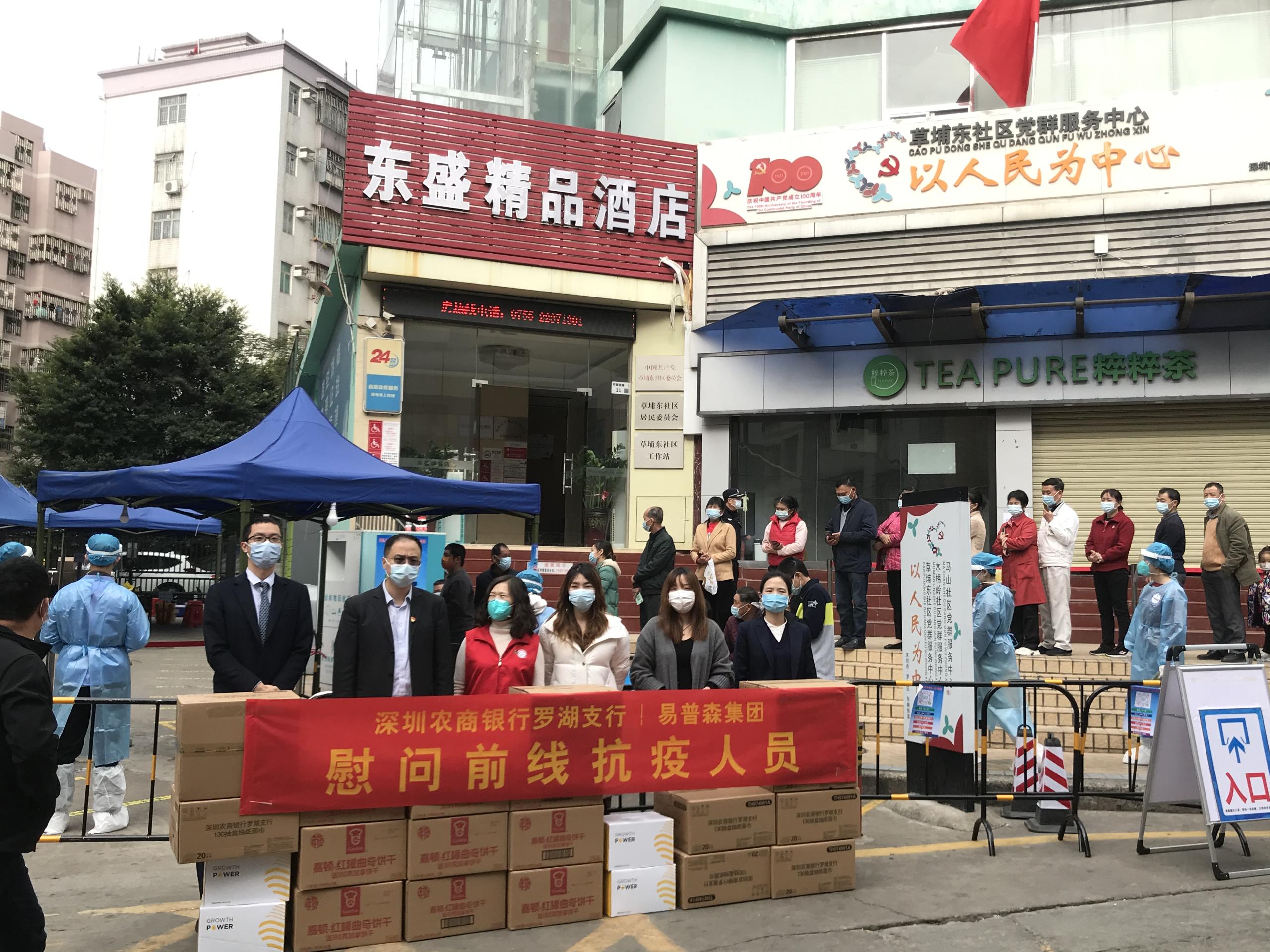 此次慰問活動的開展也得到了深圳農(nóng)商銀行羅湖支行企業(yè)客戶的積極響應。易普森集團、深圳市富寶東門市場管理有限公司在獲悉深圳農(nóng)商銀行此次活動后,積極響應,表示要為羅湖區(qū)做一份貢獻,于是與該行攜手為羅湖區(qū)前線抗疫人員送去物資和問候。
