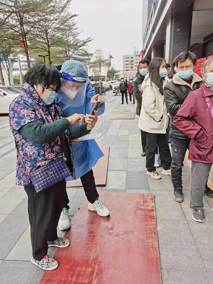 2月17日,景華社區(qū)公園核酸篩查檢測(cè)點(diǎn)。面對(duì)大量參與核酸檢測(cè)的市民,青年志愿者耐心做好指引解釋,指導(dǎo)群眾掃碼、采集信息,教居民操作檢測(cè)小程序,開展防疫宣傳,維護(hù)現(xiàn)場(chǎng)秩序,保障核酸檢測(cè)工作井然有序進(jìn)行。因核酸檢測(cè)點(diǎn)在居民區(qū),老年人較多,對(duì)核酸檢測(cè)登記小程序操作流程不熟悉,再加上是夜晚檢測(cè),現(xiàn)場(chǎng)光線不足,給服務(wù)工作帶來(lái)一些難題,但青年志愿者們沒(méi)有退縮,而是拿出在工作中服務(wù)客戶的勁頭,更細(xì)致、更耐心解決問(wèn)題,做好志愿服務(wù)。