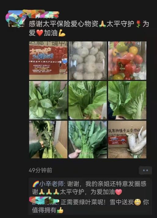 為積極應(yīng)對(duì)疫情,太平人壽上海分公司迅速反應(yīng),推出“太平守滬為愛(ài)加油”客戶(hù)關(guān)愛(ài)計(jì)劃。公司與滬上知名果蔬種植基地合作,將新鮮采摘的蔬果,由持有48小時(shí)內(nèi)核酸陰性證明的太平保險(xiǎn)代理人,為客戶(hù)朋友直線(xiàn)送達(dá)。