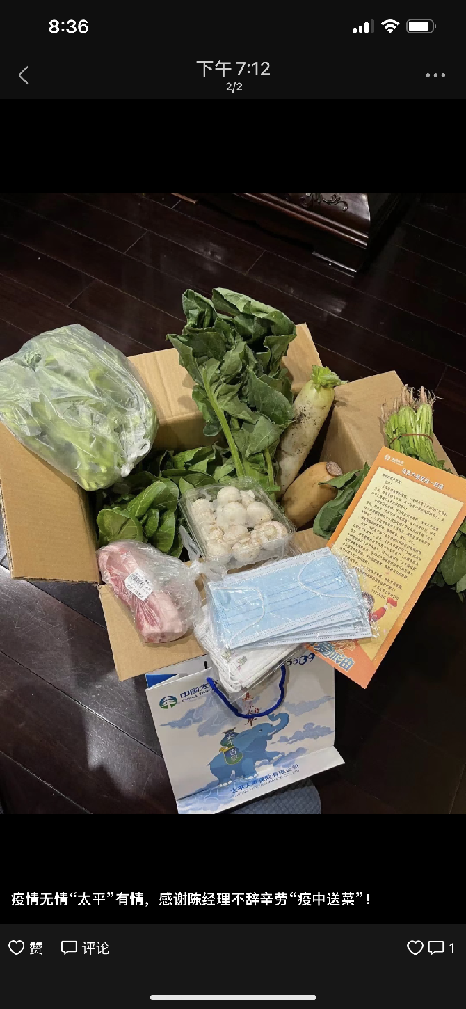 太平人壽代理人,紛紛化身太平守“滬”者,為疫情封控中的廣大客戶(hù)雪中送炭,切實(shí)解決了搶菜難的問(wèn)題。據(jù)悉,活動(dòng)推出至今,已有上百位客戶(hù)收到了“太平守護(hù)者”送上的暖心慰問(wèn),越來(lái)越多的客戶(hù)感受到了太平的溫暖。