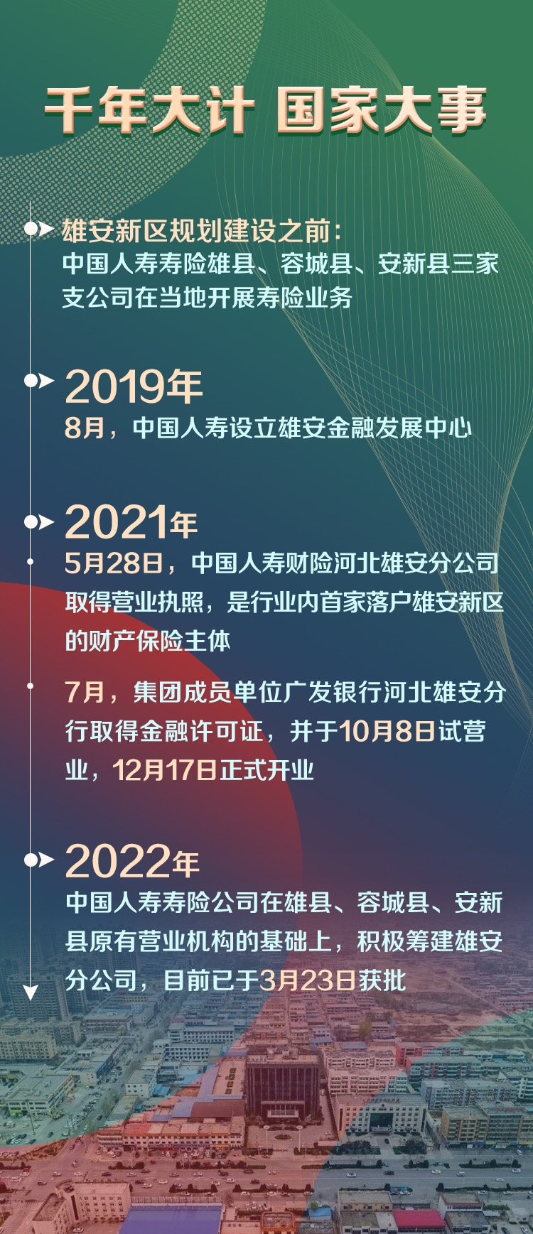 深圳新聞網(wǎng)2022年4月1日訊 設(shè)立雄安新區(qū),對(duì)承接北京非首都功能、探索人口密集地區(qū)優(yōu)化開(kāi)發(fā)模式、調(diào)整優(yōu)化京津冀空間結(jié)構(gòu)、培育推動(dòng)高質(zhì)量發(fā)展和建設(shè)現(xiàn)代化經(jīng)濟(jì)體系的新引擎具有重大現(xiàn)實(shí)意義和深遠(yuǎn)歷史意義。作為金融央企,中國(guó)人壽緊跟國(guó)家發(fā)展步伐,時(shí)刻保持“趕考”的清醒和堅(jiān)定,在保險(xiǎn)、投資、銀行三大業(yè)務(wù)板塊上協(xié)同發(fā)力,高標(biāo)準(zhǔn)高質(zhì)量服務(wù)雄安新區(qū)建設(shè)。