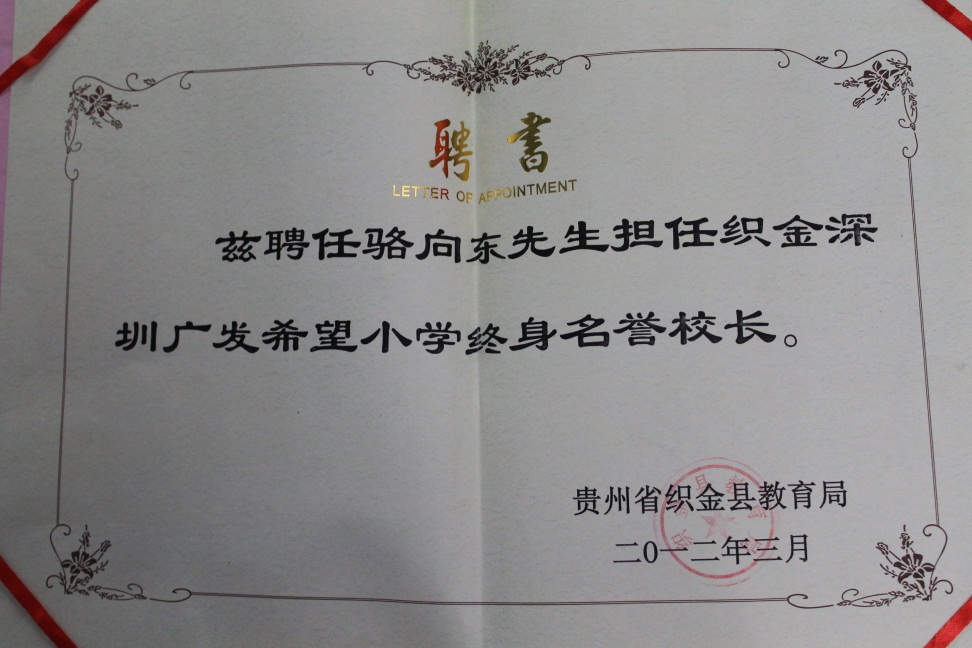 2013年,在駱向東的退休儀式上,織金縣教育局將一張希望小學(xué)終身名譽(yù)校長的聘書,鄭重交到了他的手上?!拔液軜s幸能代表廣發(fā)銀行深圳分行黨委去推動這件事,但公益事業(yè)任重道遠(yuǎn),我相信愛心基因會在廣發(fā)一直傳承下去?!笔聦?shí)也正如駱向東所言,從1998年籌建希望小學(xué)至今,一代代廣發(fā)人身體力行,讓愛心助學(xué)一棒接力一棒。