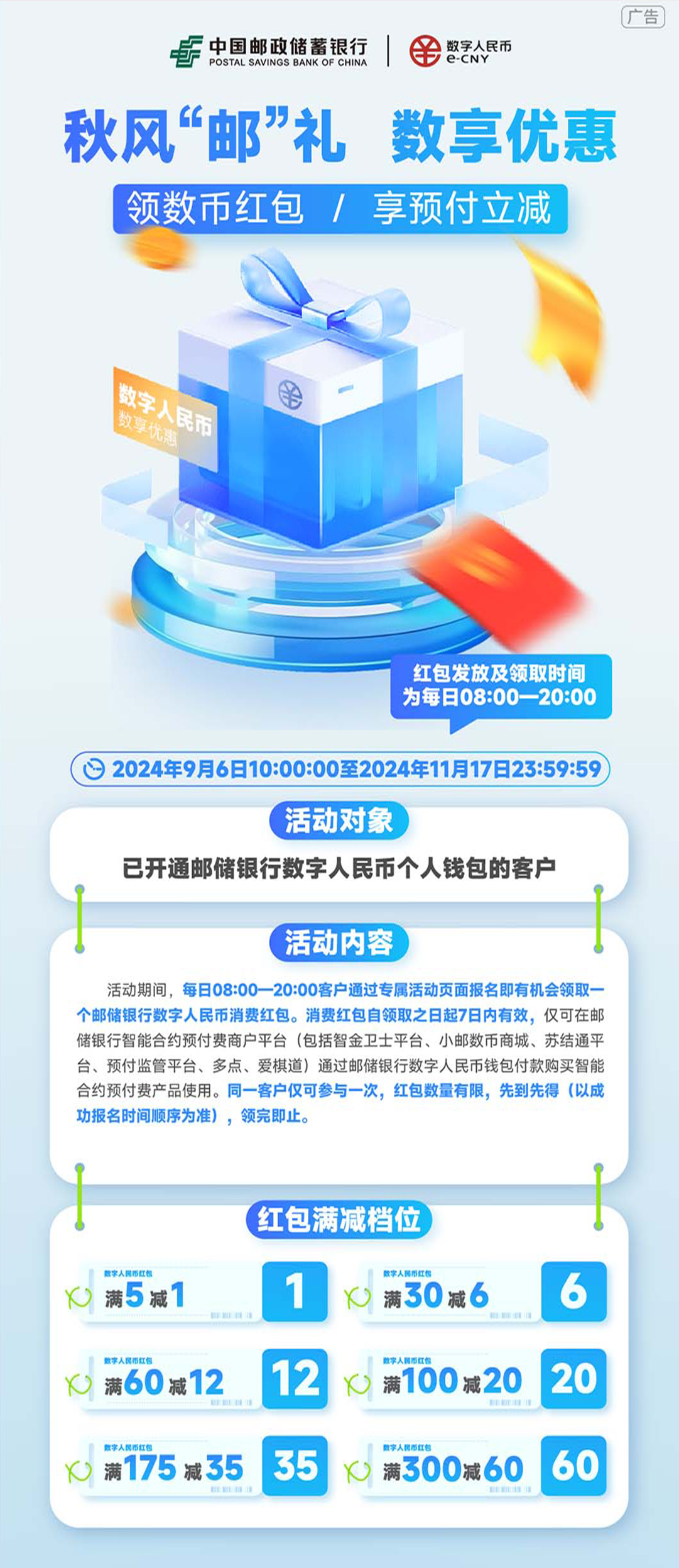 2024年9月6日10:00至2024年11月17日23:59,已開通郵儲銀行數(shù)字人民幣錢包的客戶,活動期間,每日08:00-20:00客戶通過專屬活動頁面報名即有機會領(lǐng)取一個郵儲銀行數(shù)字人民幣消費紅包。消費紅包自領(lǐng)取之日起7日內(nèi)有效,僅可在郵儲銀行智能合約預(yù)付費商戶平臺(包括智金衛(wèi)士平臺、小郵數(shù)幣商城、蘇結(jié)通平臺、預(yù)付監(jiān)管平臺、多點、愛棋道)通過郵儲銀行數(shù)字人民幣錢包付款購買智能合約預(yù)付費產(chǎn)品使用。同一客戶僅可參與一次,紅包數(shù)量有限,先到先得(以成功報名時間順序為準(zhǔn))領(lǐng)完即止。