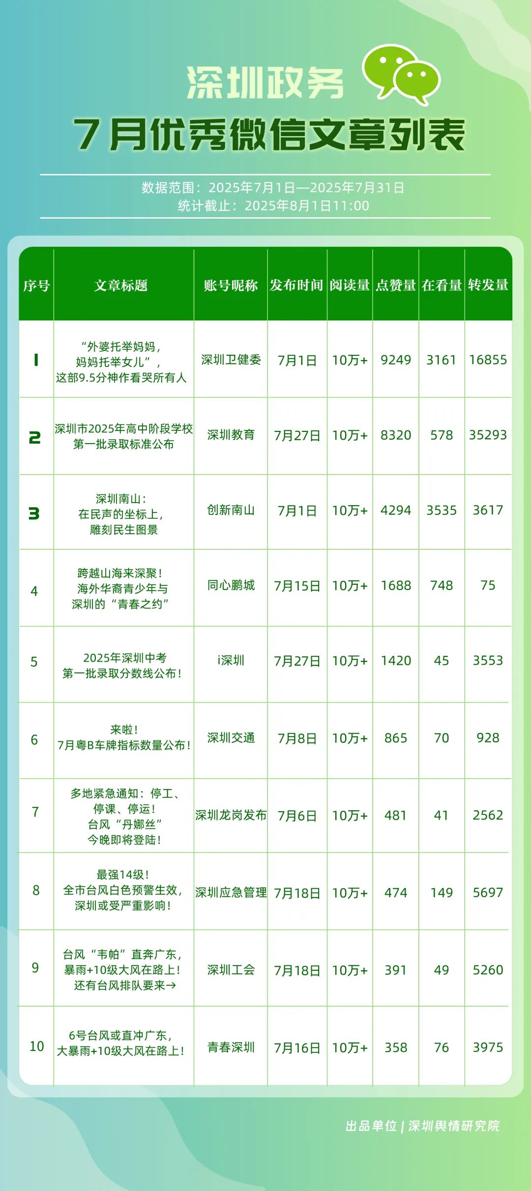 7月,30個(gè)政務(wù)微信公眾號(hào)入選“深圳優(yōu)秀政務(wù)微信公眾號(hào)”榜單,其中包括“深圳衛(wèi)健委”“深圳龍崗發(fā)布”“幸福福田”“創(chuàng)新南山”“i深圳”“深圳教育”“青春深圳”“深圳工會(huì)”“深圳光明”“濱海寶安”等。7月,“深圳衛(wèi)健委”內(nèi)容專(zhuān)業(yè)性與傳播力優(yōu)勢(shì)穩(wěn)固,整體表現(xiàn)保持較高水平,位于榜首;“深圳龍崗發(fā)布”聚焦民生服務(wù)與區(qū)域活動(dòng)宣傳,實(shí)現(xiàn)傳播效果提升,位居第二;“幸福福田”表現(xiàn)同樣不俗,排名第三。“創(chuàng)新南山”“深圳教育”“深圳工會(huì)”等也積極發(fā)布高質(zhì)量信息與服務(wù)內(nèi)容,能夠較好平衡內(nèi)容“質(zhì)”與“量”,排名有所提升。上榜微信公眾號(hào)依托特色優(yōu)勢(shì)深耕內(nèi)容創(chuàng)作,將優(yōu)質(zhì)內(nèi)容作為核心支撐,成為政務(wù)傳播領(lǐng)域的優(yōu)秀典范。