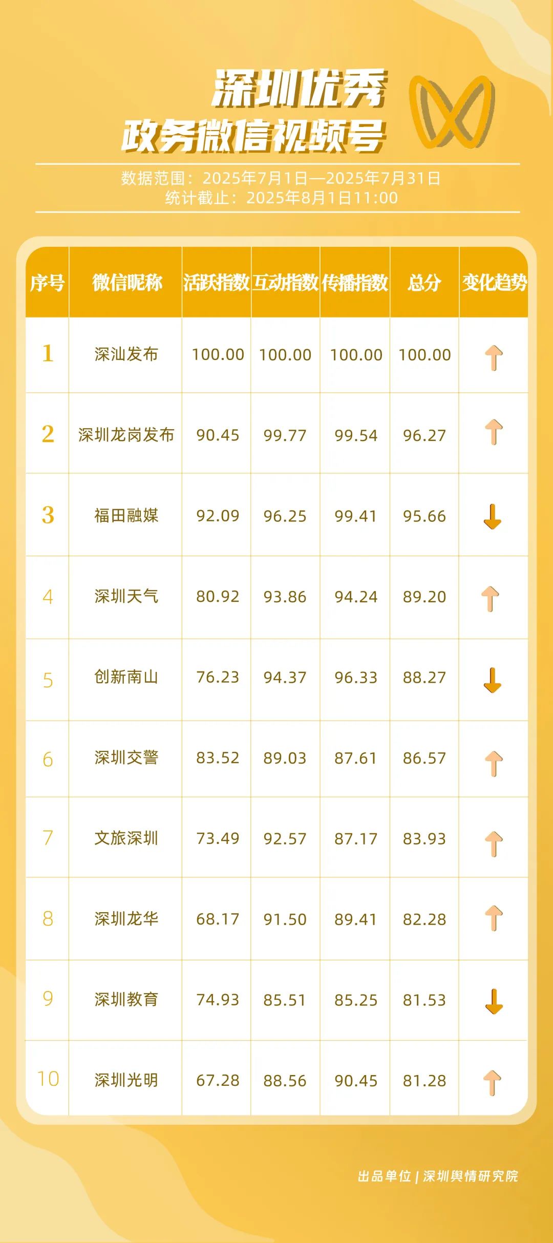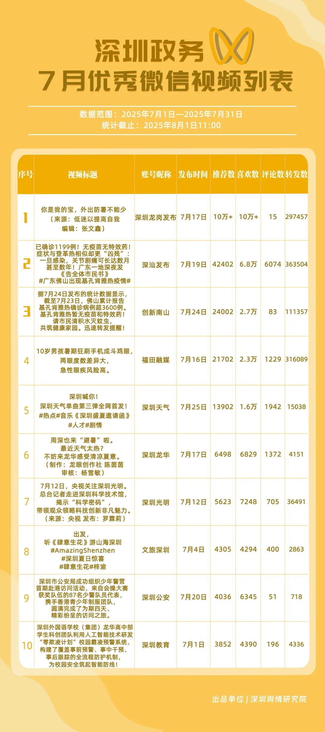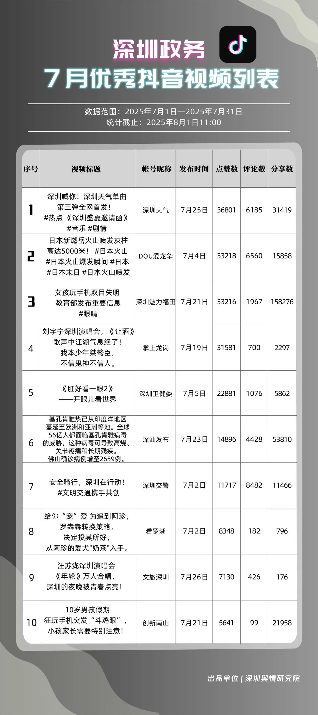 7月,“深圳天氣”“DOU愛(ài)龍華”“深圳魅力福田”“深汕發(fā)布”“掌上龍崗”“創(chuàng)新南山”“深圳交警”“文旅深圳”“深圳衛(wèi)健委”“深圳普法”共10個(gè)政務(wù)抖音號(hào)獲得“優(yōu)秀政務(wù)抖音號(hào)”稱(chēng)號(hào)。其中,“深圳天氣”互動(dòng)指標(biāo)獲滿分,憑借氣象與趣味相結(jié)合的創(chuàng)新科普形式,領(lǐng)跑優(yōu)秀政務(wù)抖音號(hào);“DOU愛(ài)龍華”“深圳魅力福田”分別位列第二、三名,通過(guò)聚焦網(wǎng)絡(luò)熱點(diǎn)、挖掘創(chuàng)意內(nèi)容,不斷提升傳播效能,展現(xiàn)出強(qiáng)大的政務(wù)新媒體影響力;“深汕發(fā)布”“掌上龍崗”“創(chuàng)新南山”等賬號(hào)緊隨其后,上榜的優(yōu)質(zhì)政務(wù)抖音號(hào)用短視頻語(yǔ)言強(qiáng)化傳播效果,展現(xiàn)了鮮明的賬號(hào)特色和風(fēng)采。