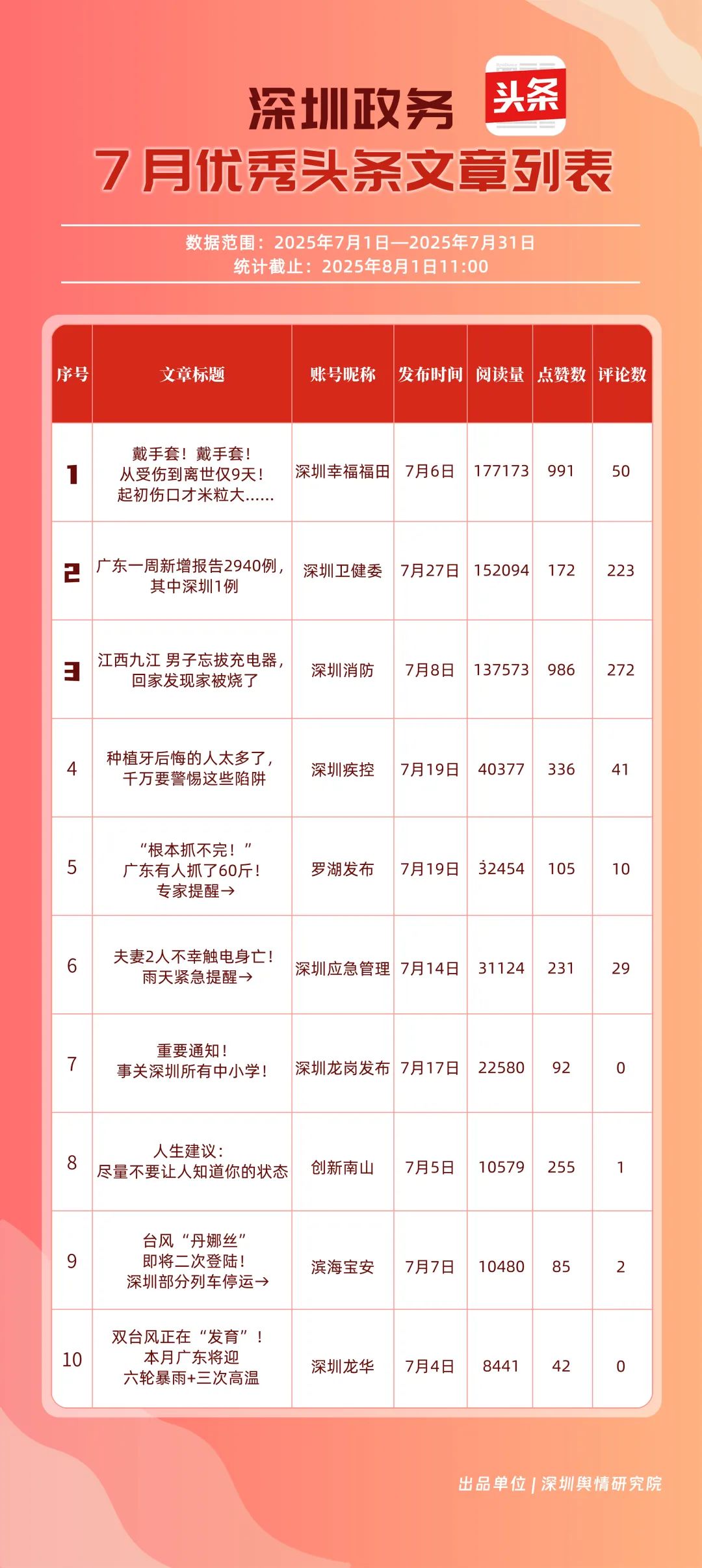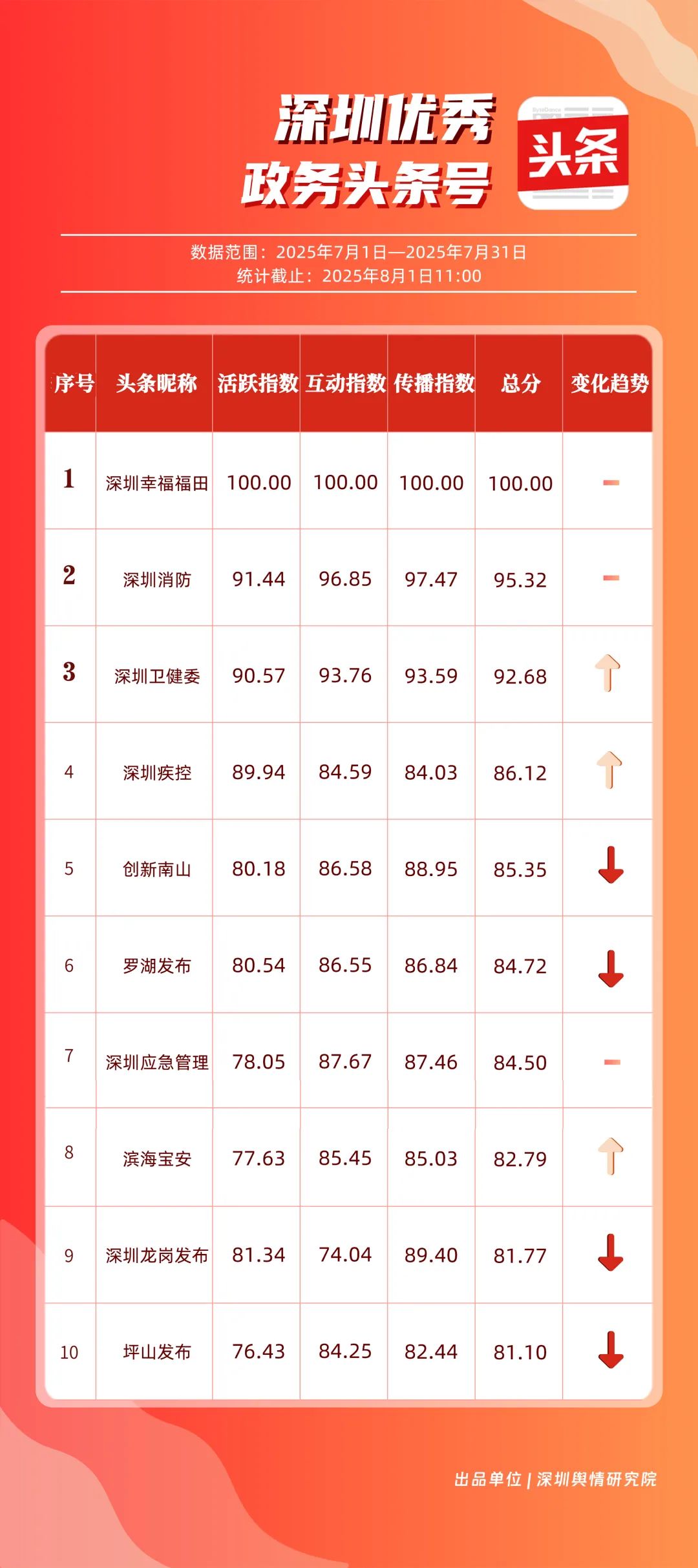 7月,“深圳幸福福田”“深圳消防”“深圳衛(wèi)健委”“深圳疾控”“創(chuàng)新南山”“羅湖發(fā)布”“深圳應(yīng)急管理”“濱海寶安”“深圳龍崗發(fā)布”“坪山發(fā)布”共10個(gè)政務(wù)頭條號(hào)入選“優(yōu)秀政務(wù)頭條號(hào)”榜單?!吧钲谛腋8L铩薄吧钲谙馈睉{借優(yōu)質(zhì)內(nèi)容持續(xù)吸引用戶關(guān)注,穩(wěn)居前二;“深圳衛(wèi)健委”表現(xiàn)亮眼,評(píng)分達(dá)92.68分,排名較6月有所上升;“深圳疾控”同樣進(jìn)步明顯,在疾病預(yù)防控制信息傳播上發(fā)揮了重要作用。“創(chuàng)新南山”“羅湖發(fā)布”“深圳應(yīng)急管理”等上榜賬號(hào),也各展所長(zhǎng),始終將優(yōu)質(zhì)內(nèi)容作為核心抓手,成為政務(wù)新媒體領(lǐng)域內(nèi)容創(chuàng)作與傳播的典范。