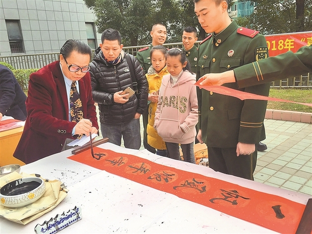 當(dāng)日,來(lái)到現(xiàn)場(chǎng)的書(shū)畫(huà)家有林明川、葉自力、黃漢明、劉振海、賴福豪、唐伯龍、葉生茂、鄧日龍、陳思羽9位,由于桌子數(shù)量有限,書(shū)畫(huà)家們還輪流上場(chǎng),搞起了“筆墨接力”。前來(lái)圍觀、求字求畫(huà)的官兵以及家屬們絡(luò)繹不絕。最受歡迎的是題寫(xiě)“?!弊趾痛郝?lián)。臨近春節(jié),大家都想求一個(gè)好意頭。書(shū)畫(huà)家們對(duì)官兵、家屬們的要求,來(lái)者不拒,全情滿足。