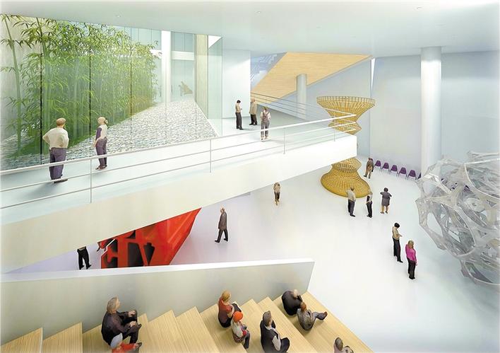 記者在現(xiàn)場看到,整個(gè)建筑由中國設(shè)計(jì)和當(dāng)代設(shè)計(jì)兩大主題館立體互相扣合而成,地面設(shè)計(jì)為全開放空間,可連接小鎮(zhèn)大街,下沉式庭院,亦可為不同活動(dòng)或展覽提供空間,打造為區(qū)域中的藝術(shù)核心文化廣場。