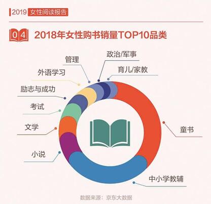 京東大數(shù)據(jù)顯示,女性的讀書量顯著提升,2018年,女性讀者人均購書7.6本,高于男性,女性讀者在紙質(zhì)書購買上的人均消費近230元,女性的“閱讀力”正在變得越來越強。從圖書銷量上看,2018年女性讀者購買最多的圖書是童書、中小學教輔、小說、文學和考試,可見對于大部分女性而言,購書的主要目的是出于育兒的需求。