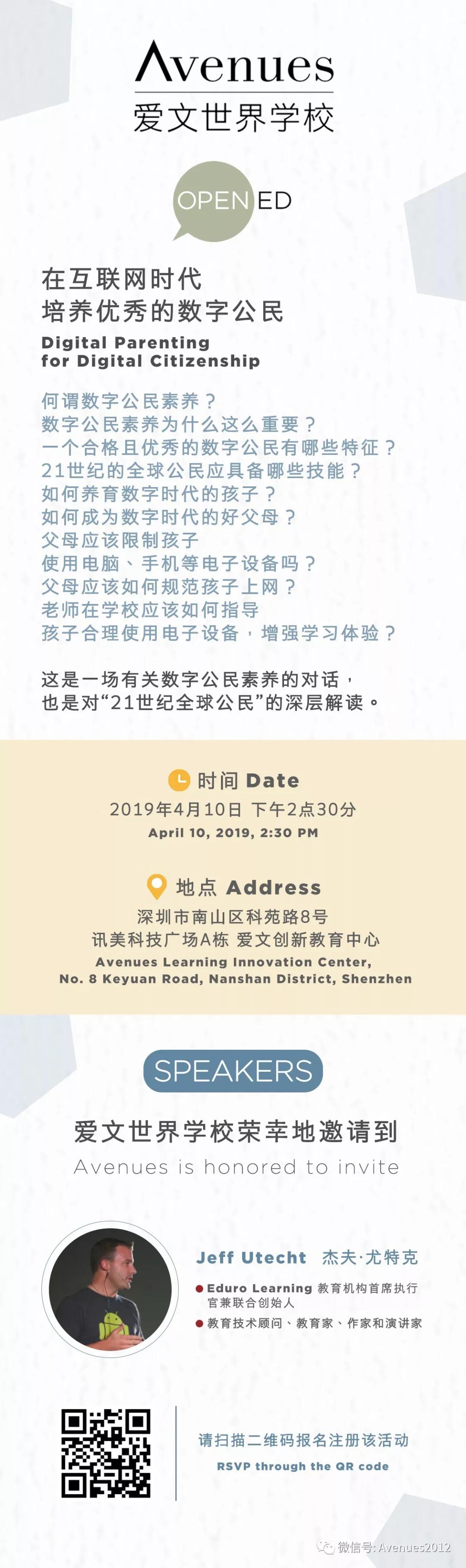 愛(ài)文世界學(xué)校專門邀請(qǐng)了知名的教育技術(shù)顧問(wèn)、教育家、作家及演講家杰夫?尤特克 (Jeff Utecht),就數(shù)字公民素養(yǎng)話題進(jìn)行深入探討,從何謂數(shù)字公民素養(yǎng),到數(shù)字公民素養(yǎng)的重要性,再到父母和老師如何培養(yǎng)孩子成為一位優(yōu)秀的數(shù)字公民。