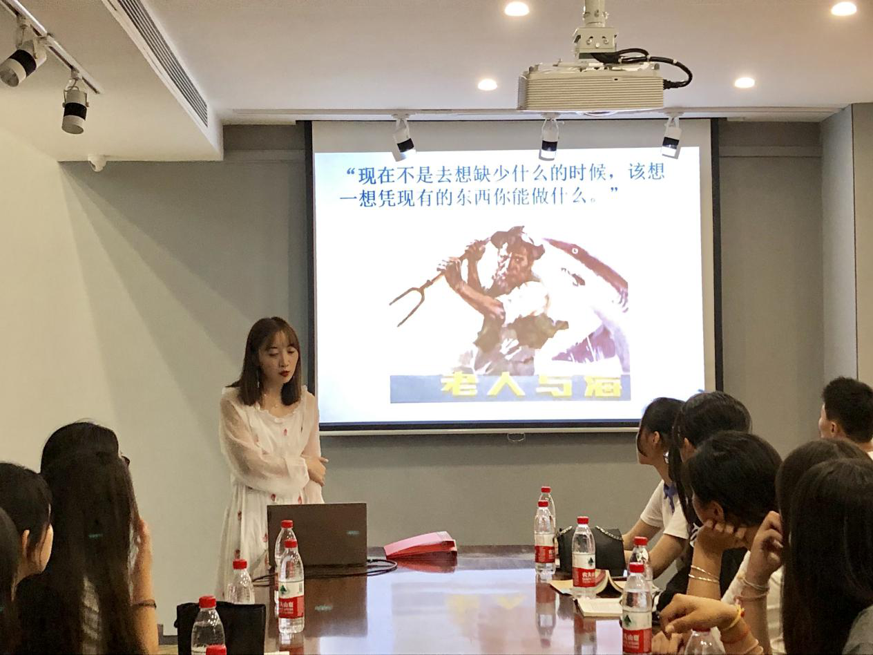 《老人與?!吠ㄟ^(guò)講述一個(gè)老漁夫的故事,揭示了人類(lèi)共同的命運(yùn),給讀者帶來(lái)關(guān)于勇氣、不屈不撓、與命運(yùn)作斗爭(zhēng)的精神啟迪。圍繞“生而為人,請(qǐng)務(wù)必戰(zhàn)斗到底”這一主題,邵洋提出了“是選擇放棄,還是一往直前?”這一問(wèn)題,引起在座同學(xué)的思考。隨后,她又通過(guò)解讀《老人與?!分械挠飨笈c藝術(shù)、生命與理想,為同學(xué)們總結(jié)值得學(xué)習(xí)的寫(xiě)作思路。